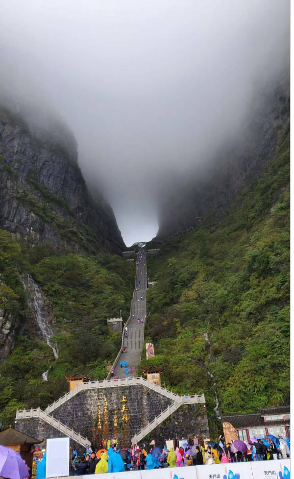于是在我們又轉了7層電梯后,終于來到了天門洞上。依然是白茫茫的一片,天門山棧道,底下原本高聳陡峭的山崖,在白霧的襯托下,一點兒也不讓人覺得害怕了,只是雨天濕滑,內心在默默祈禱千萬不要摔倒就好。